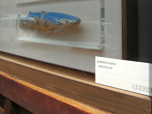 ホン・ジョンピョは1976年ソウル生まれ。主に透明レジンを素材とし、型取りと研磨の繰り返しによる手法で、消費社会や大衆文化・サブカルチャーを象徴するイメージを新たな文脈に浮かび上がらせる作品制作を続けています。今回展示される魚をかたどった作品郡は「ArtActually - Fish」と題されたシリーズで、すべて魚市場で売られている食料としての魚たちがその造形のもとになっています。ビビッドな色に置き換えられ、モダンデザインのインテリア装飾のような姿を身につけたこれらの魚たちは、「彫刻」という既成概念の水圧を受け流しながら自在に浮遊し、何を「美しい」と定義するかというアートの根本問題の波の底をスルスルと泳ぎ回っているかのようです。