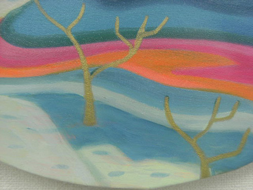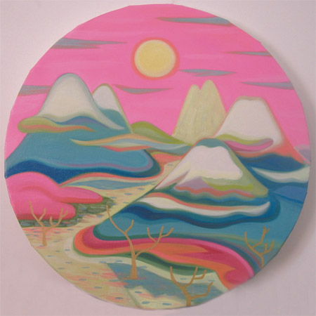 田中加織は禅寺などに見られる伝統的な日本庭園をインスピレーションとした絵画作品を制作してきました。特に「蓬莱山」と呼ばれる庭園の中心をなす池の人工の島を主題とした作品群では、蛍光色を思わせるピンクやグリーン、イエローなど、ポップでありながら抑制されたトーンの色彩に置き換えられた風景が、理想郷を再現した本来の庭園とは異なる不気味さや不穏さ、畏怖を誘う気配をも発しています。描かれた理想郷が、決して手の届かない存在であり、また手を触れてはならない存在であるということが暗示されているのかもしれません。