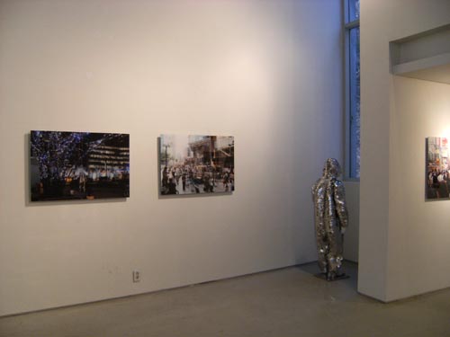 Tamiko Watanabe (1982- ) presents a project titled “Bodysuit for Assimilation,” with photographs and video work. The artist herself wears a suit made with hundreds of small steel plates, shaped like fish scales or flower petals. Each plate is polished up until it becomes like a small piece of mirror; thus, dressed in the bodysuit, the scene or the landscape around her can be seen reflected on her whole body (theoretically at least), erasing off her existence at all, making her invisible and dissolving her into the setting perfectly (theoretically, again). However, in reality, wherever she walks she clearly stands out from the scene and the crowd. Flavored with humor and absurdity, Watanabe’s work succeeds in pointing to the subtle borderline between integration and alienation both physical and psychological. For this exhibition she photographed several new works in Seoul.
