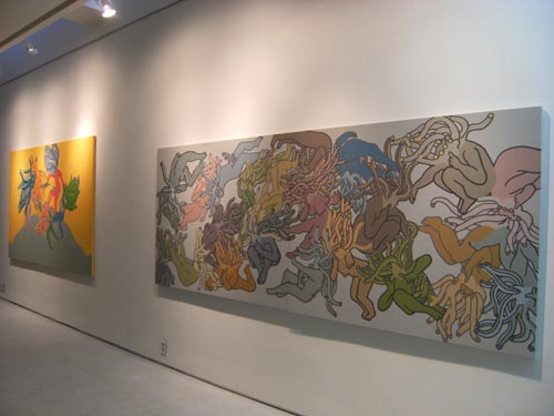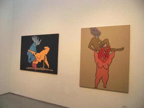 Still a graduate school student at Sungshin Women’s University in Seoul, Choi Nari (1983- ) is a young painter who works in en-vogue “Pop” style. The characters in her painting, painted in bright colors and with manga-inspired bold contours, are assigned with roles to play to illustrate the artist’s interest in human relationships, especially the one between man and woman. Despite her age, Choi is not quite romantic about the subject; she deals with it quite coolly, with a cynic’s eyes, and brings home the irony of expected manliness and womanliness, especially in Korean society where you can still sense the air of male-domination based upon Confucian traditions.