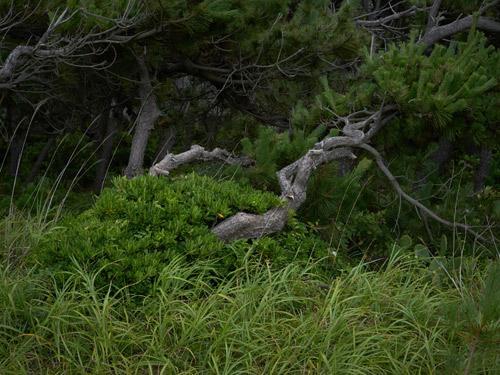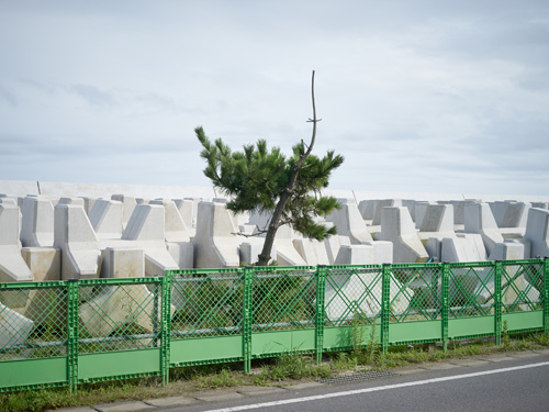 《shelterbelt》は、日本各地の海岸に点在する防砂林を撮影したシリーズです。海岸防砂林は近世以降、農地や住宅地を砂の害から守るために、松を中心に植林・造成されてきた人工林ですが、現代においてはその経済・社会的な機能性は薄れ、「美観」「環境」の名のもとに防砂林そのものが保護の対象となるという逆転現象も発生しています。風を受けて歪んだその樹形には、自然をコントロールしようとする人間の欲望の形が映し出されているようにも見えます。