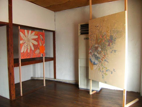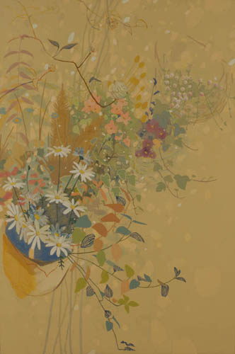 花や植物をモチーフに、日本の伝統絵画の空間構成を現代的な解釈で取り込んだ油彩画を制作する、