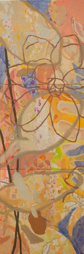 構成的で装飾的とも言える、日本画のフラットさを直截に想起させる作品から、花や木の具体的な形と、抽象的な線やパターンが同居する、より直感的で自由な描画の作品まで、荻野の作品は幅広く展開されています。そこには、画面上で視点の動揺・逍遥を誘う動的なダイナミックさ、重層的で複雑な空間性が通底して存在します。