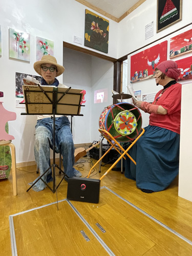 総合工作芸術家 だるま森+えりこ(本展出品作家)によるパレスチナの詩の朗読+オリジナル曲の唄と演奏