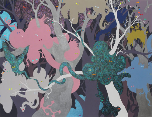油彩ならではのダイナミックな筆触により、自然の風景や植物のイメージを湛え生命のエネルギーが滲み出るような抽象絵画に取り組んでいる寺島みどり。アクリル絵具を用い、明瞭なエッジのラインとビビッドな色遣いによる色面構成で人や動植物などのモチーフをファンタジックに表現する冬耳。本展は、ともに色彩の画家として知られながら対照的な制作手法・志向を持つ2人の絵画作家が、色のない「ヤミ」を共通のテーマとして制作した絵画作品による二人展となります。